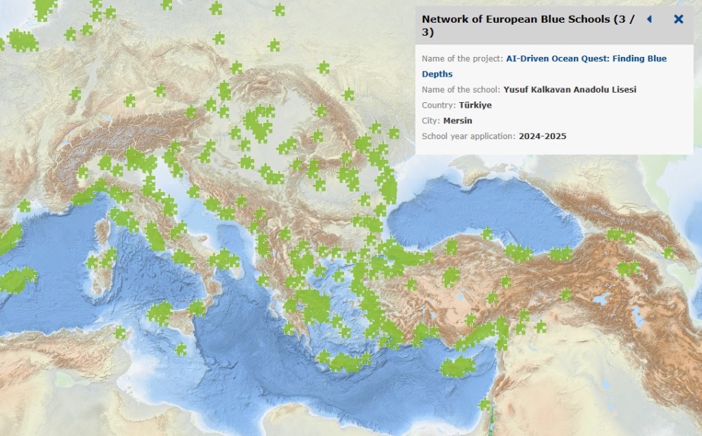 Yusuf Kalkavan Anadolu Lisesi olarak Kimya öğretmenimiz Gonca BAHAR ve İngilizce öğretmenimiz İ.Işıl GILIÇ ortaklığında yürüttüğümüz “AI-Driven Ocean Quest: Finding Blue Depths” eTwinning projemiz, Avrupa genelinde okyanus okuryazarlığı ve sürdürülebilirlik konularında farkındalık yaratan okulların yer aldığı Avrupa Mavi Okulları (European Blue Schools) ağına kabul edilmiş, Network of European Blue Schools (EU4Ocean Coalition) haritasında yer almıştır.